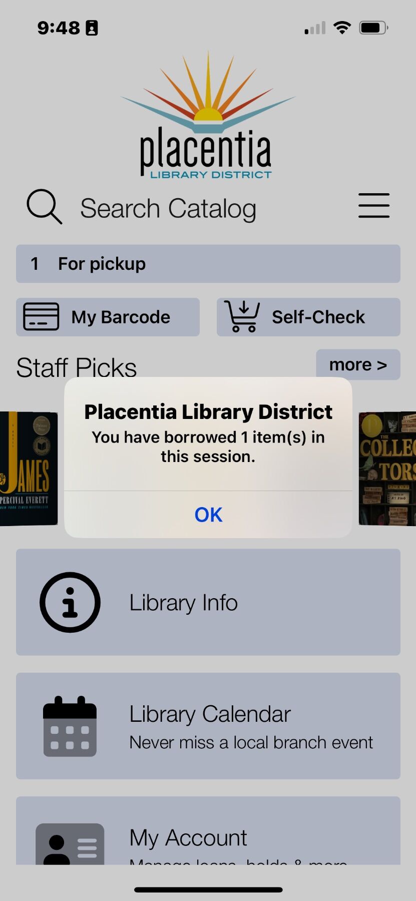 15. A pop up confirmation will appear when you have successfully checked out items. Tap OK to close confirmation Pop Up